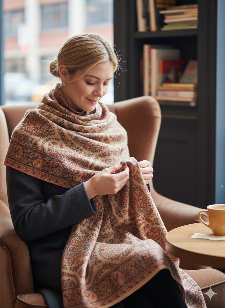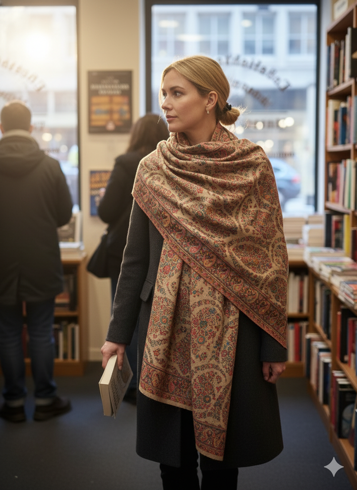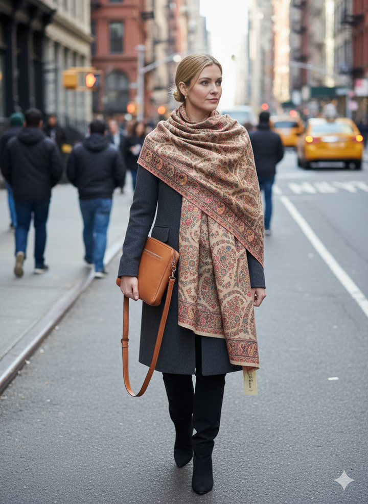 Soft and elegant, this Beige Kani Shawl features delicate light detailing on a luxurious wool blend base. The subtle Kani patterns enhance its understated charm, making it ideal for both everyday wear and refined occasions. It’s a perfect blend of comfort and tradition.