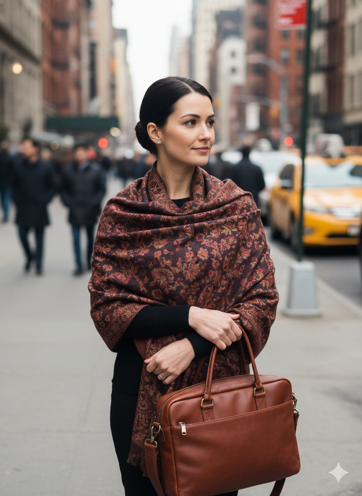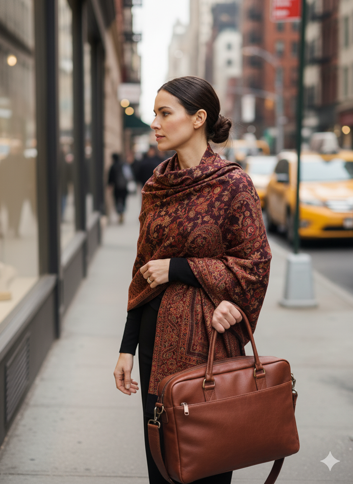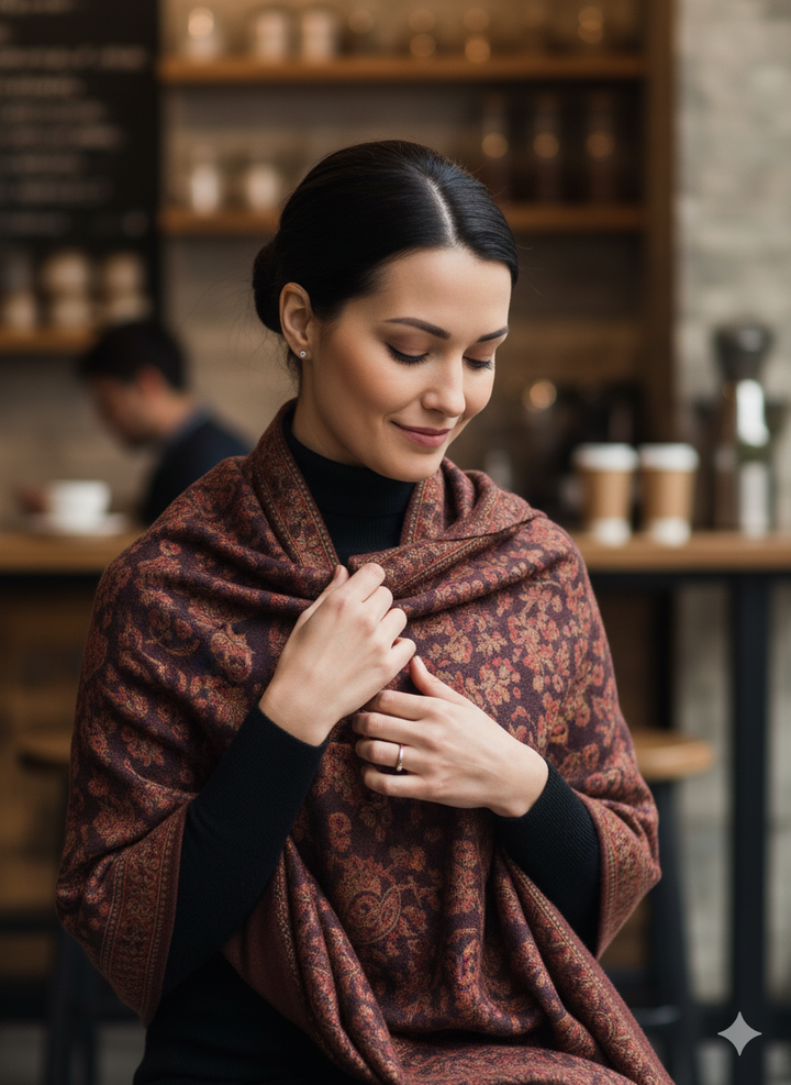 This Classic Black and Maroon Jamawar Shawl features intricate detailing on a luxurious wool blend fabric. Its rich black hue and masterful craftsmanship make it a versatile accessory to add depth and tradition to any outfit.
