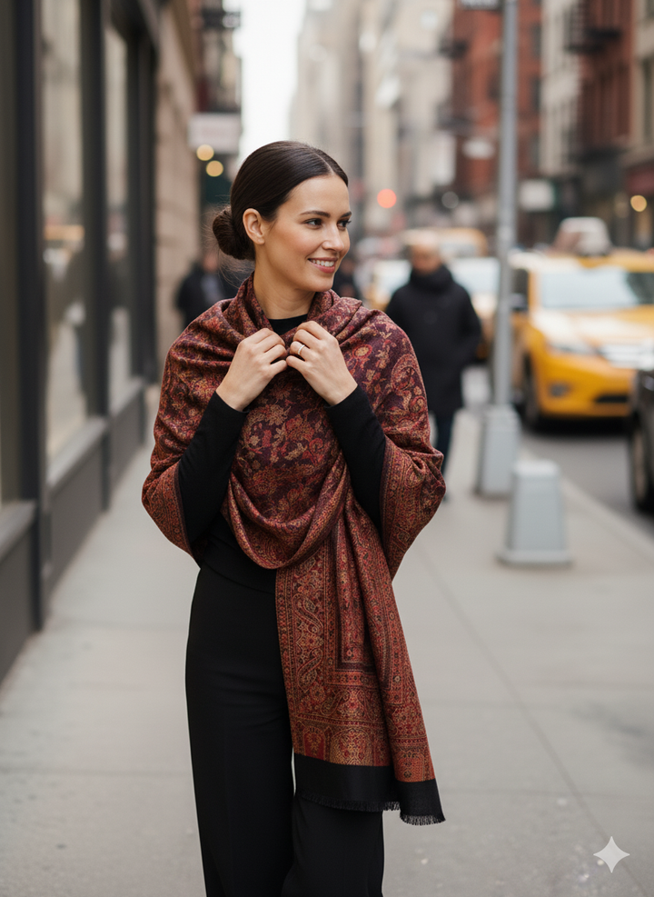 Classic Black and Maroon Jamawar Shawl with Intricate Detailing