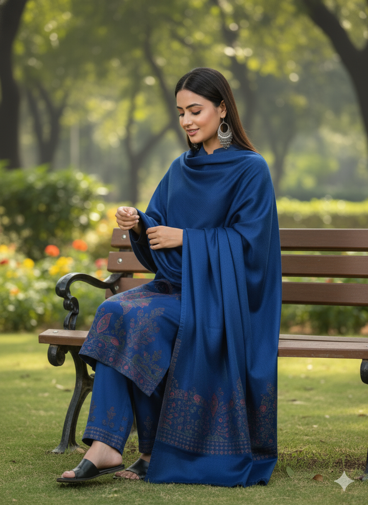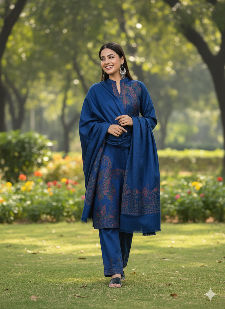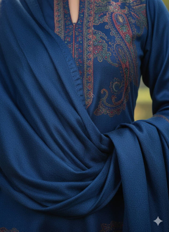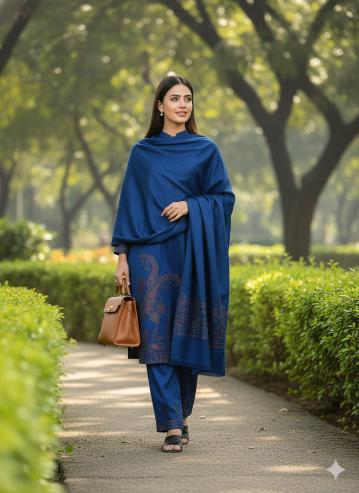This exquisite ensemble beautifully blends traditional charm with a modern aesthetic. Perfect for layering or wearing as a statement piece, it offers warmth, grace, and timeless appeal. From festive gatherings to elegant outings, it adapts effortlessly with refined style and elegance. The unstitched silhouette in classic blue makes it a distinctive addition to any winter wardrobe.