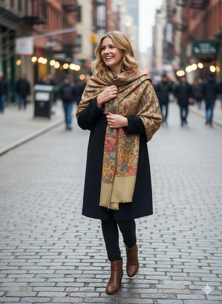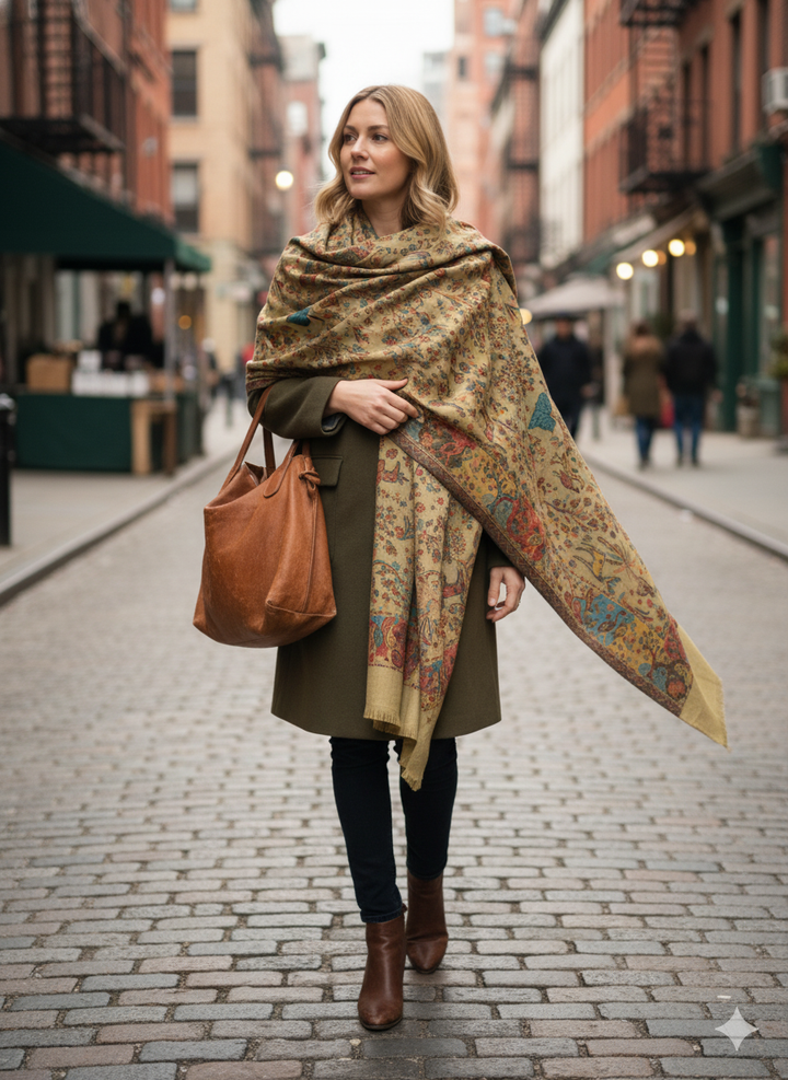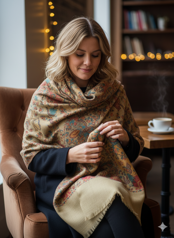 This Classic Kani Shawl in beige wool blend showcases timeless patterns woven with finesse. Its soft texture and neutral tone make it an essential accessory for everyday elegance or special occasions. Lightweight yet warm, it beautifully balances tradition and style.
