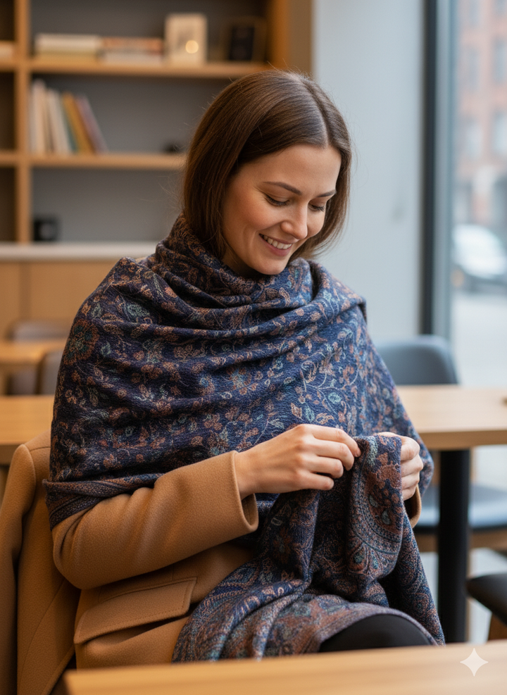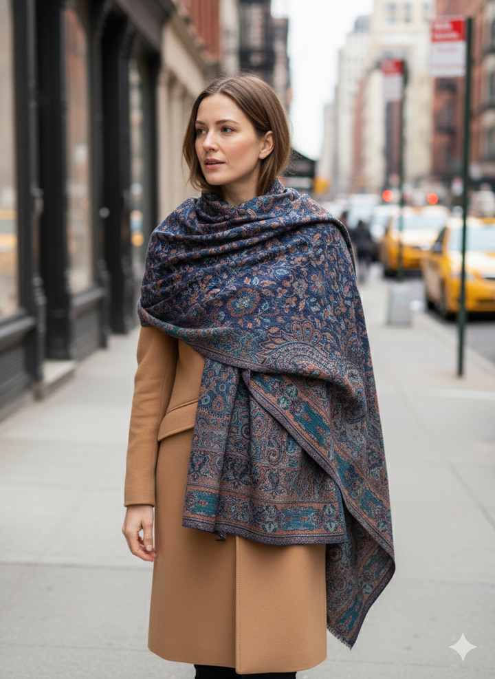Embrace classic style with this Deep Blue Jamawar Shawl, featuring traditional accents on a cozy wool blend. The rich blue tone and fine weaving craftsmanship offer a refined look suitable for diverse occasions.