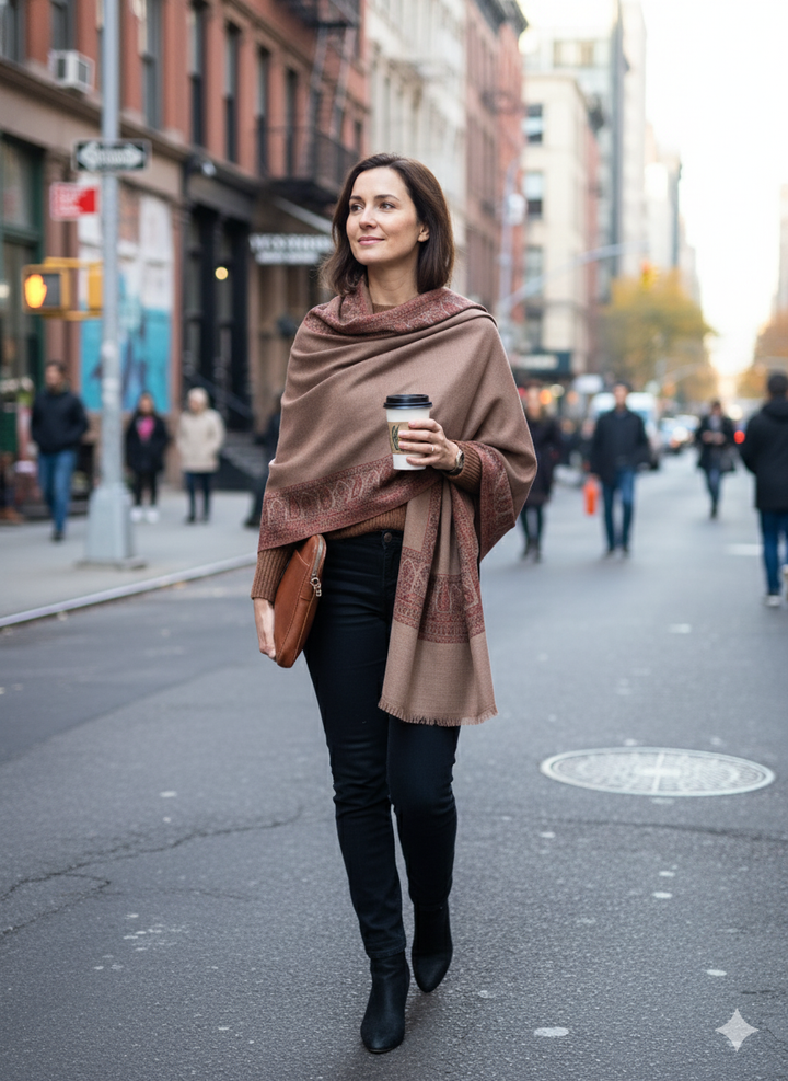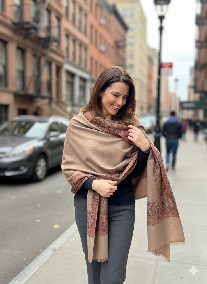This Deep Brown Jamawar Shawl blends understated elegance with subtle Jamawar weaving. Crafted from a premium wool blend, it offers warmth and a refined texture, perfect for both everyday wear and special occasions. Its earthy tone complements a variety of styles effortlessly.