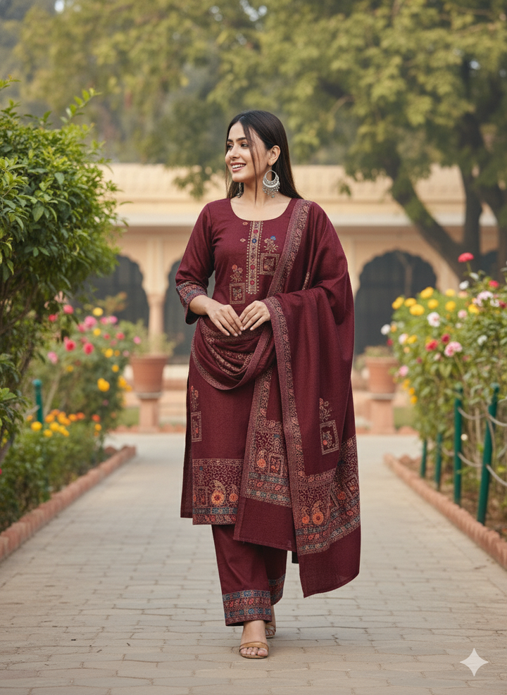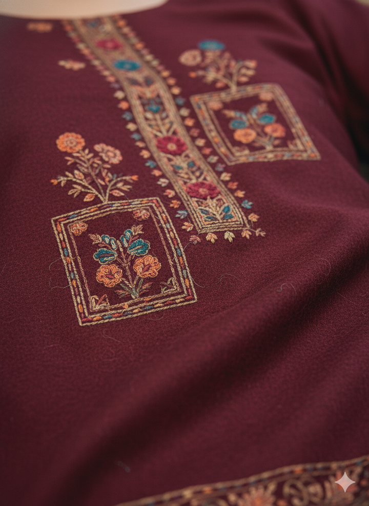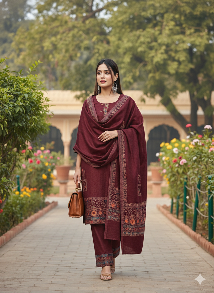This exquisite ensemble beautifully blends traditional charm with a modern aesthetic. Perfect for layering or wearing as a statement piece, it offers warmth, grace, and timeless appeal. From festive gatherings to elegant outings, it adapts effortlessly with refined style and elegance. The unstitched silhouette in classic wine makes it a distinctive addition to any winter wardrobe.