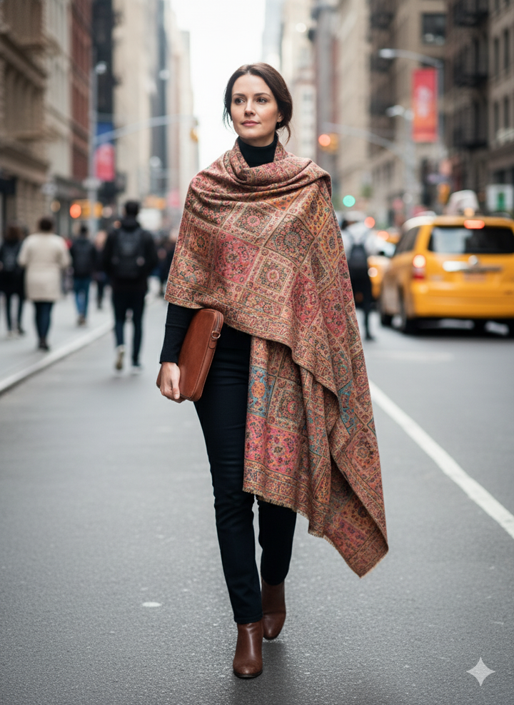 This Elegant Beige Shawl showcases delicate Kani weave accents on a luxurious wool blend base. Its neutral color palette pairs beautifully with detailed patterns, making it an ideal choice for layering or wearing solo in any season.