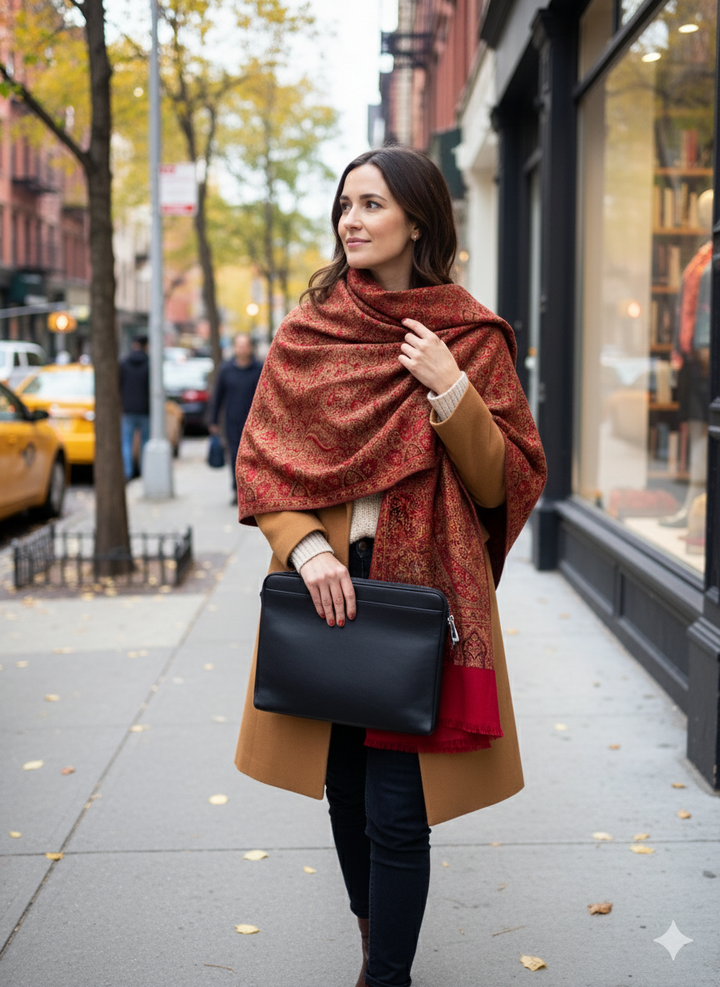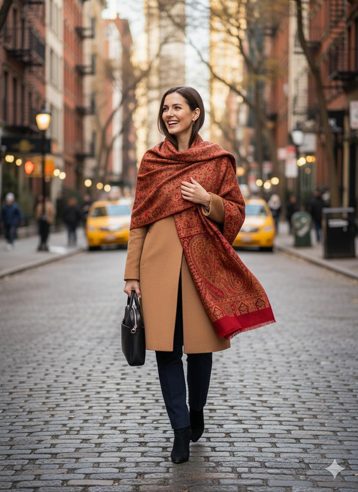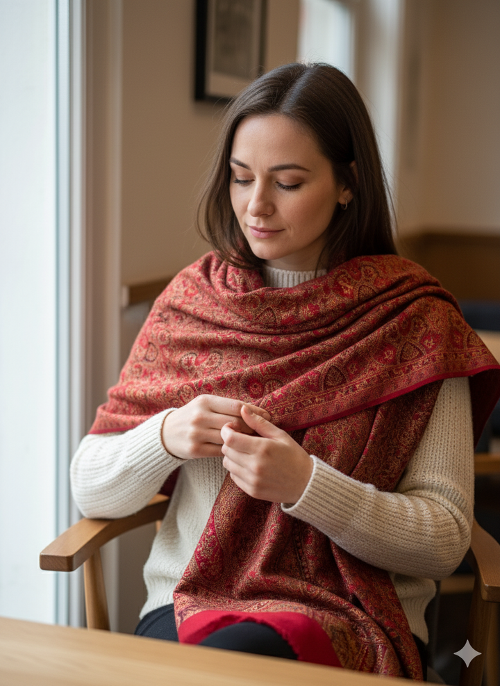 This Elegant Maroon Jamawar Shawl combines ornate patterns with a soft wool blend for a luxurious feel. The rich color and detailed weaving make it an exquisite accessory for formal occasions or festive celebrations.