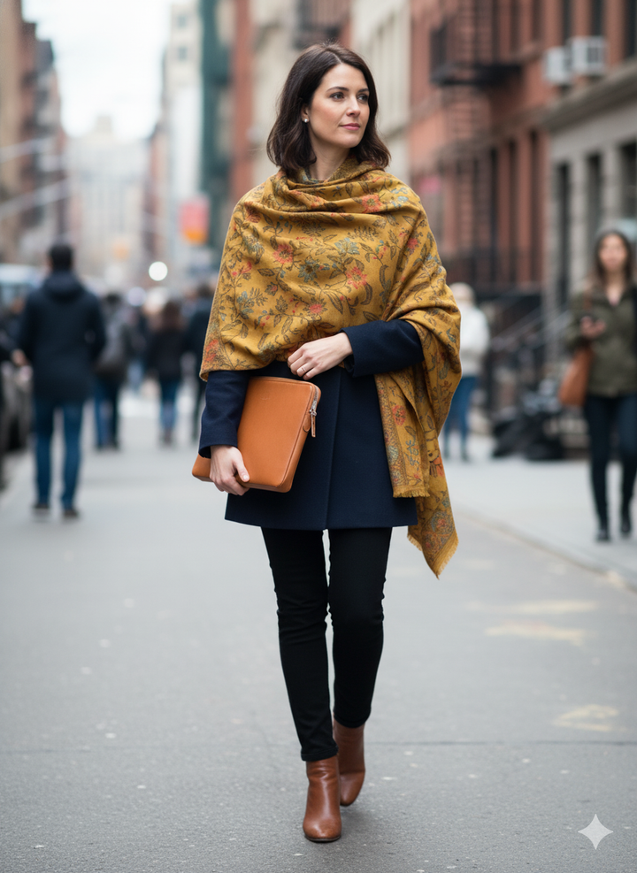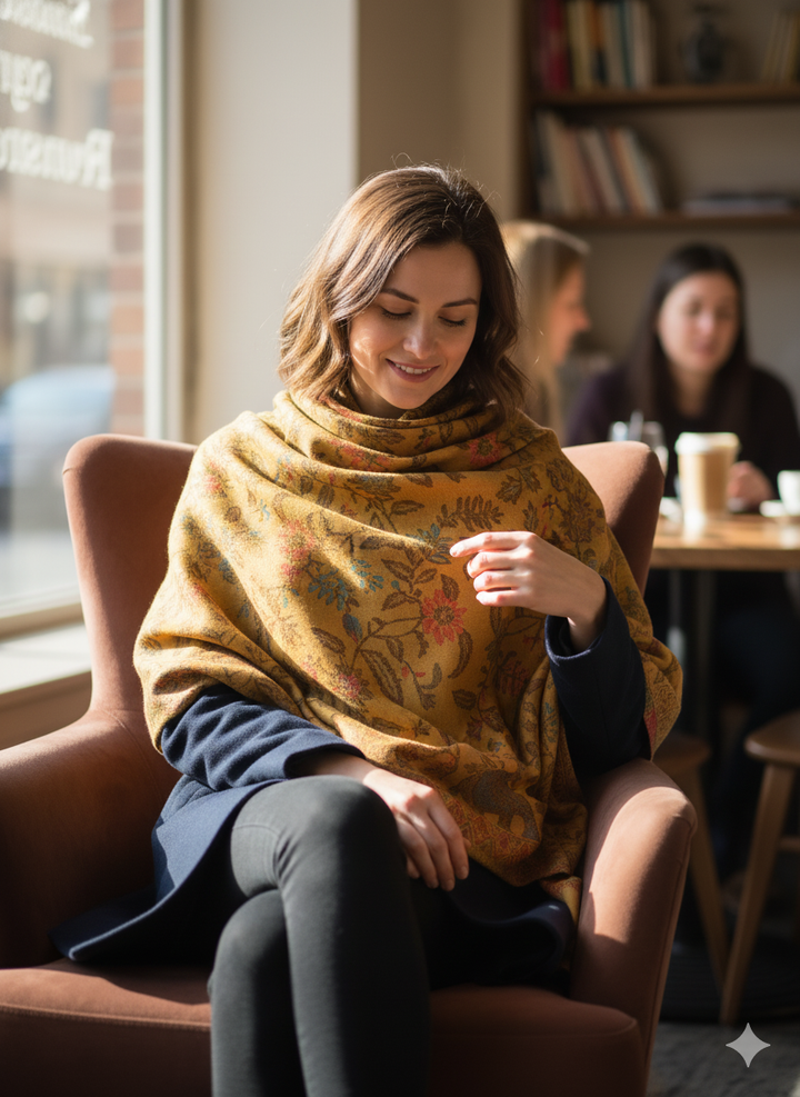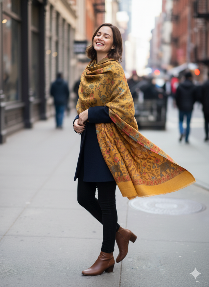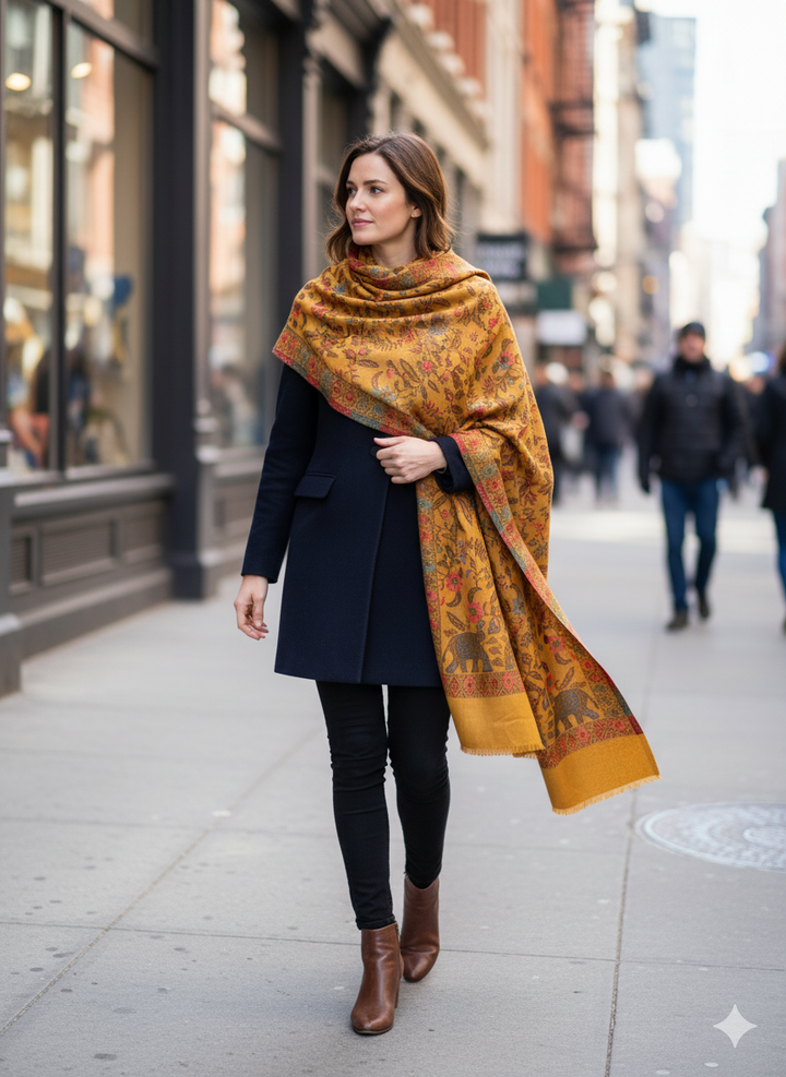 Rich in tradition, this Golden Mustard Jamawar Stole showcases a heritage texture woven into a soft wool blend fabric. Its warm golden hue and classic patterns bring sophistication and cultural charm to your wardrobe.