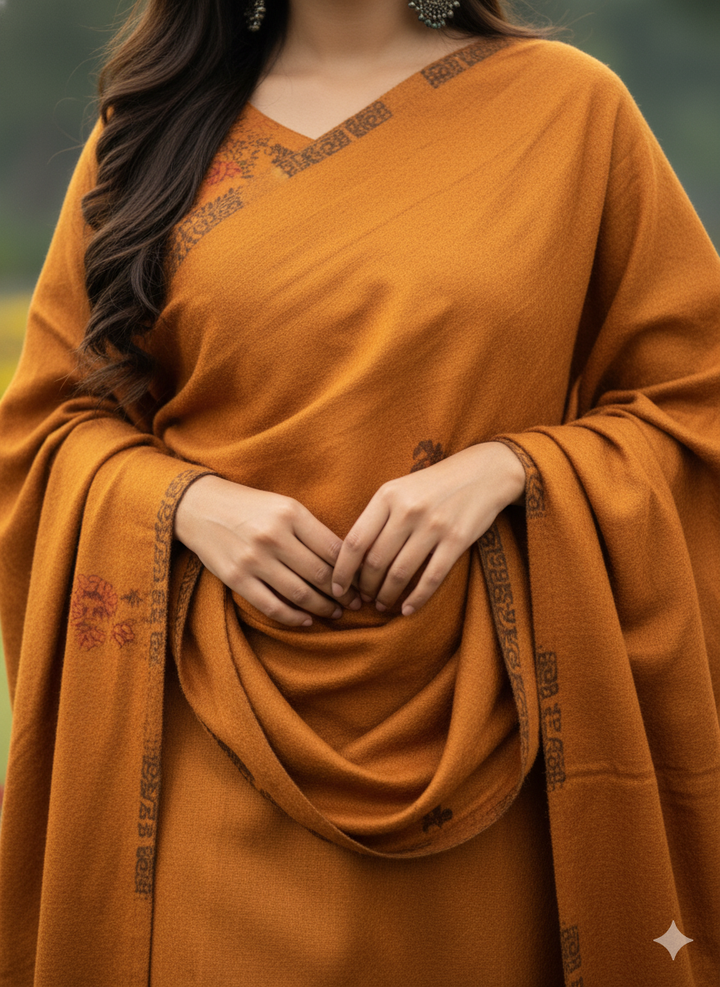 An ideal choice for those who appreciate craftsmanship and comfort, its rich woollen weave and smooth drape make it a true keepsake. Experience understated luxury through its classic hue, delicate finish, and effortless versatility. A must-have that redefines winter elegance with subtle artistry and charm.