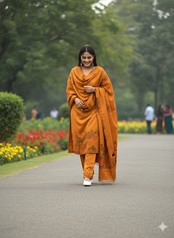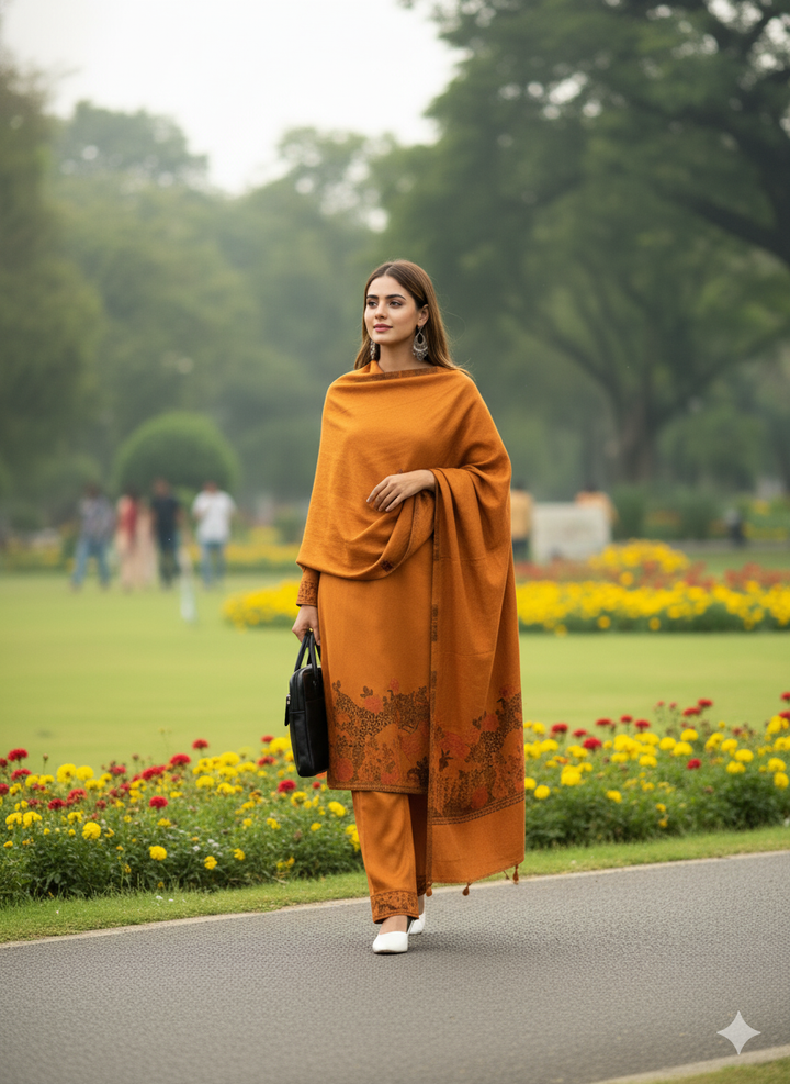 This exquisite ensemble beautifully blends traditional charm with a modern aesthetic. Perfect for layering or wearing as a statement piece, it offers warmth, grace, and timeless appeal. From festive gatherings to elegant outings, it adapts effortlessly with refined style and elegance. The unstitched silhouette in classic mustard makes it a distinctive addition to any winter wardrobe.