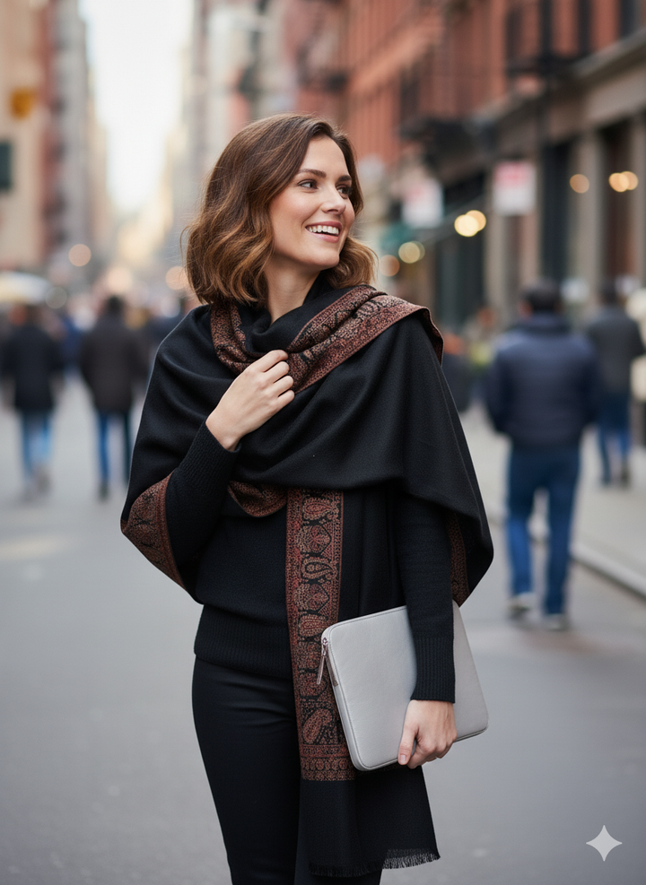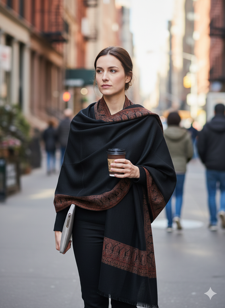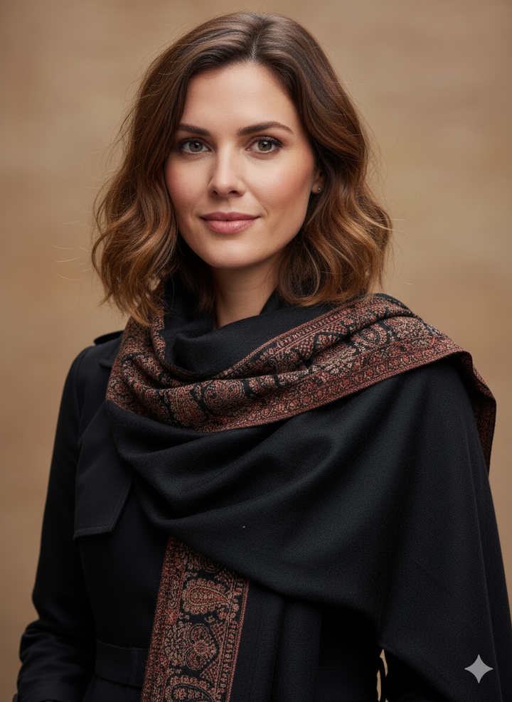 This Intricately Woven Black Jamawar Shawl pairs traditional texture with contemporary style. Crafted from a soft wool blend, its detailed weave adds dimension and elegance to the deep black fabric. Ideal for layering on cooler days, it blends artisanal craft with everyday wearability.