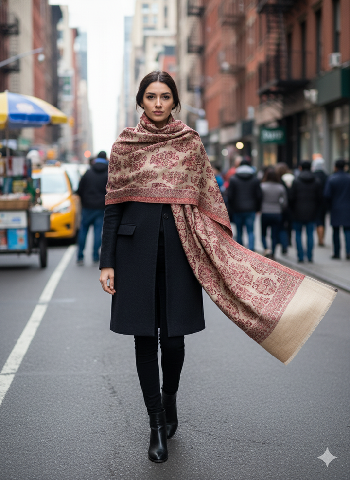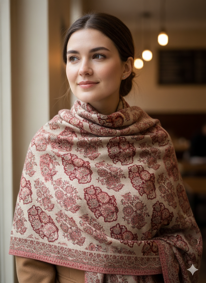 Grace your wardrobe with this Light Brown Jamawar Shawl, crafted from a soft wool blend and featuring an elegant weave that exudes timeless appeal. The warm brown shade is perfect for adding cozy sophistication to any outfit. This shawl’s intricate patterns and smooth texture provide a touch of artisanal excellence, making it ideal for cultural events or stylish everyday wear.