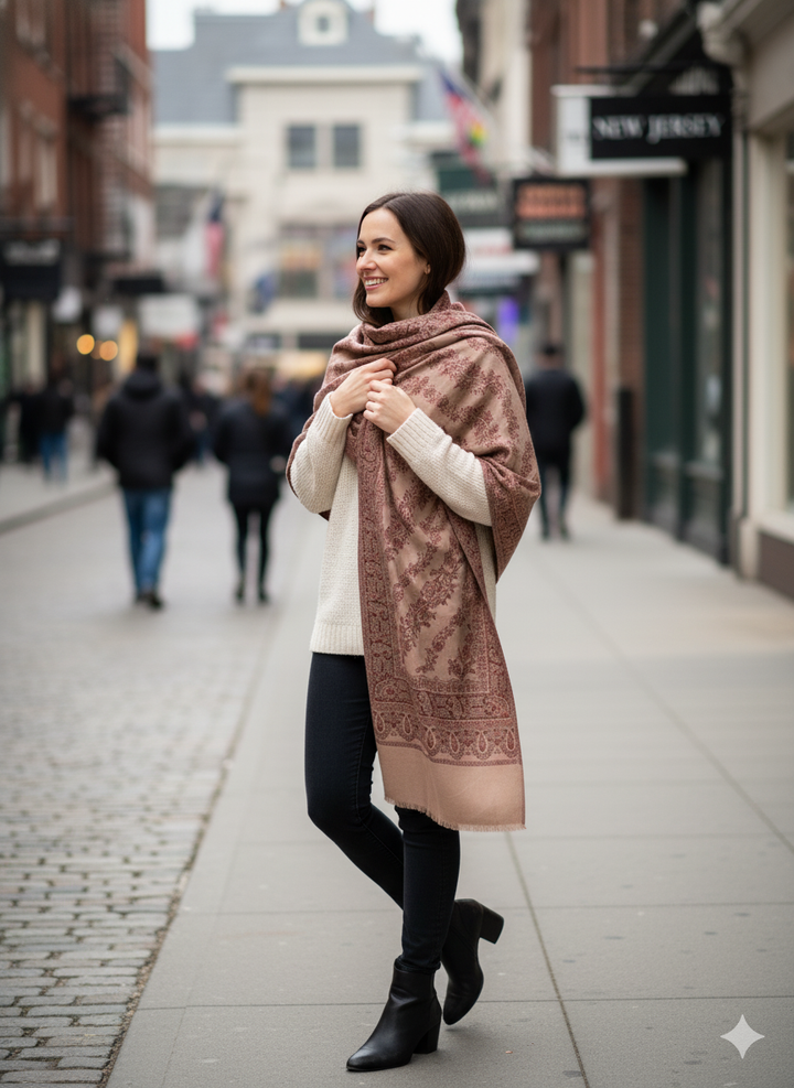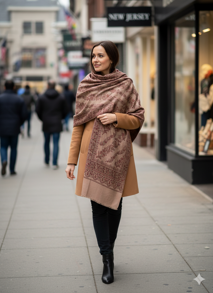 This Light Brown Jamawar Shawl captures woven elegance with its intricate patterns and smooth wool blend fabric. The warm brown shade complements a variety of outfits, making it an ideal choice for both casual and formal occasions. Lightweight yet warm, it offers a timeless accessory infused with cultural artistry and softness.