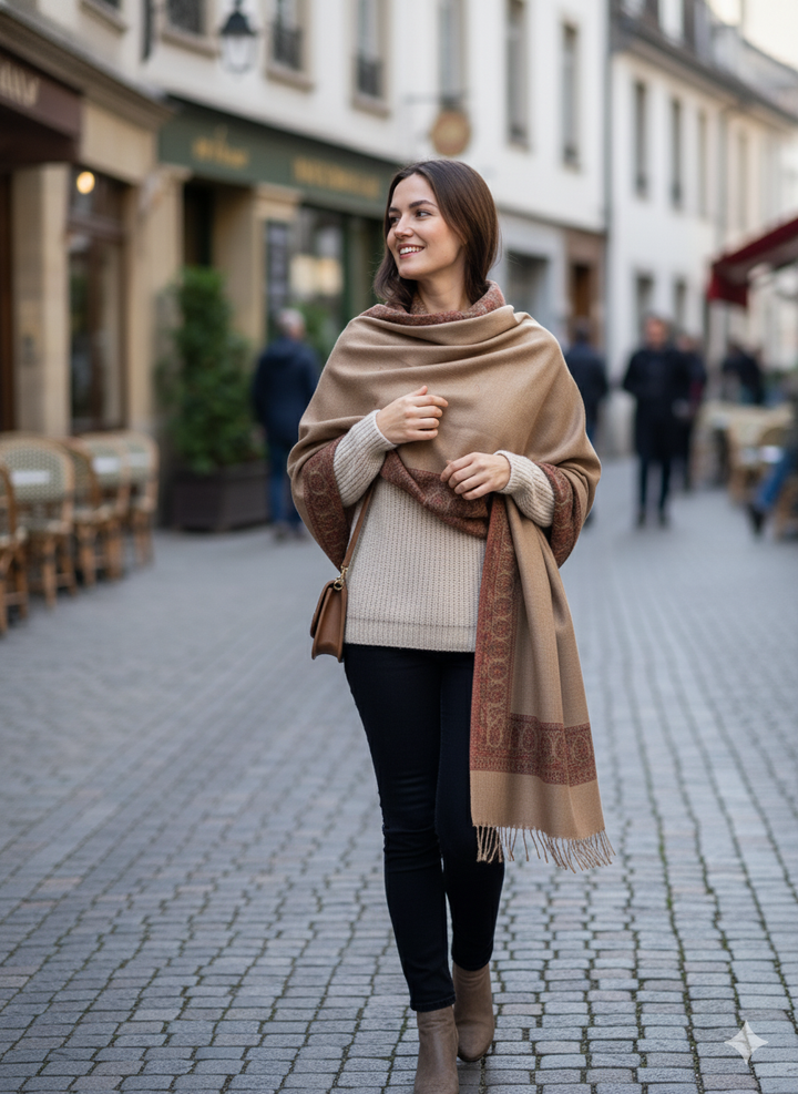 Indulge in tradition with this Luxurious Light Brown Jamawar Shawl, woven from a premium wool blend. Adorned with classic Jamawar motifs, it showcases intricate craftsmanship that adds texture and depth. The light brown tone is warm and inviting, making it a statement piece for cultural gatherings or sophisticated outings. Designed to provide both warmth and elegance, this shawl is a tribute to timeless artisanal weaving.