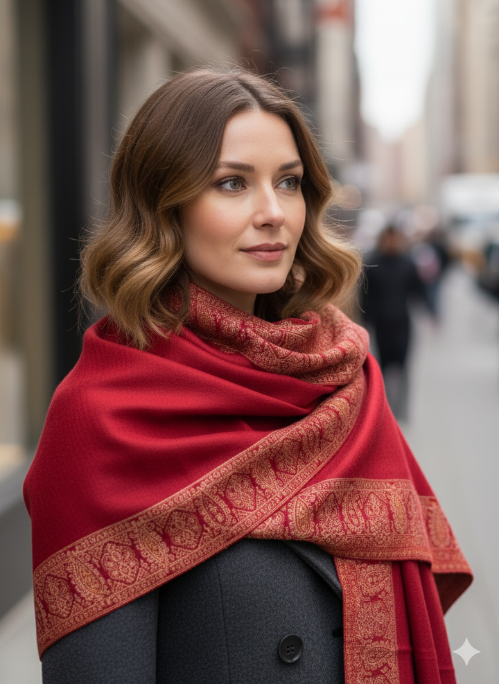 Rich Red Jamawar Shawl with Detailed Embroidery