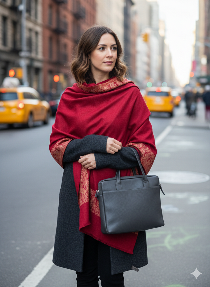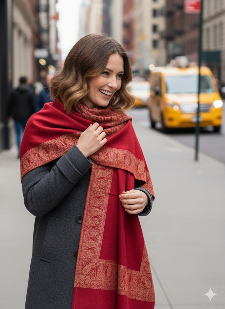 Experience luxurious warmth with this Rich Red Jamawar Shawl, featuring exquisite detailed embroidery. The wool blend fabric offers softness and durability, while the intricate design adds a royal touch. Ideal for festivals or elegant gatherings, it’s a standout accessory in any wardrobe.