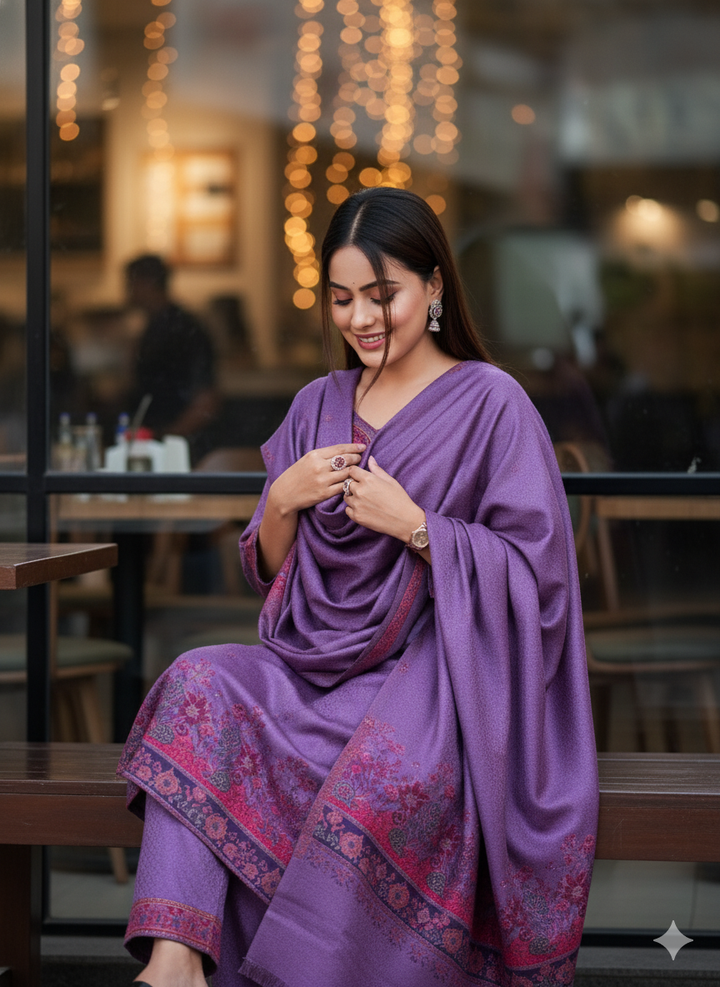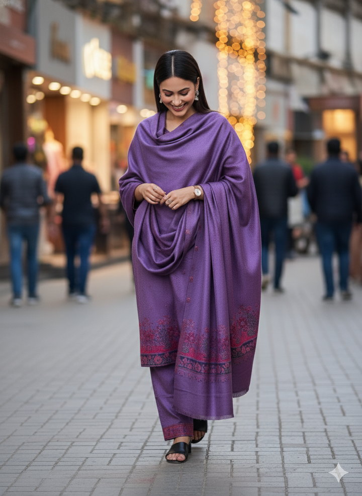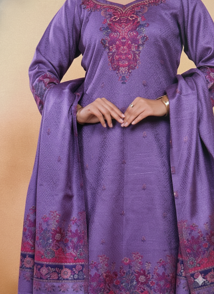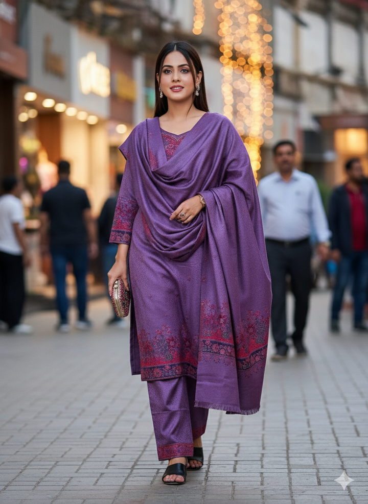 This exquisite ensemble beautifully blends traditional charm with a modern aesthetic. Perfect for layering or wearing as a statement piece, it offers warmth, grace, and timeless appeal. From festive gatherings to elegant outings, it adapts effortlessly with refined style and elegance. The unstitched silhouette in classic purple makes it a distinctive addition to any winter wardrobe.