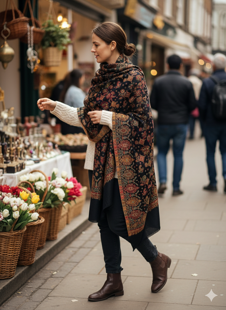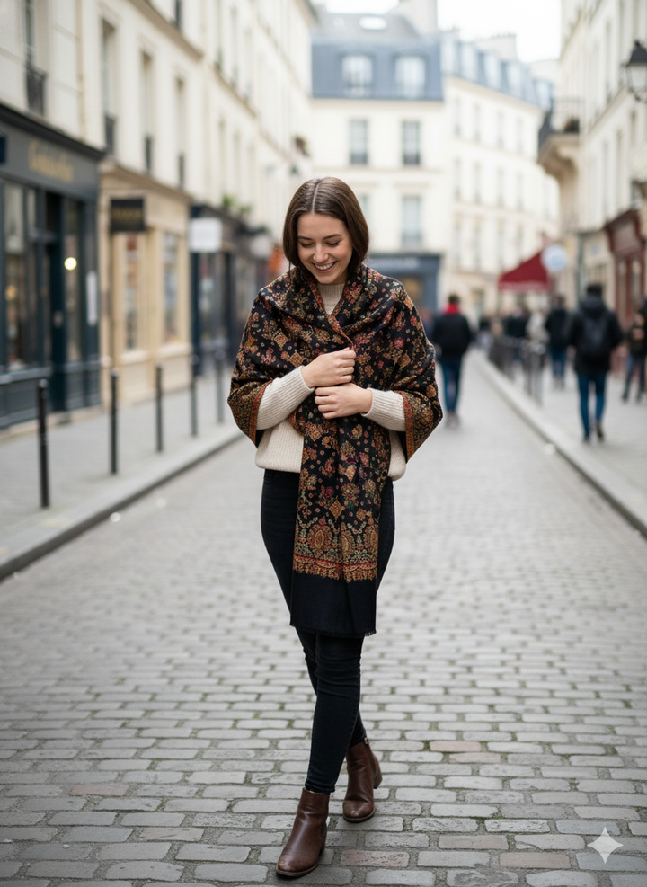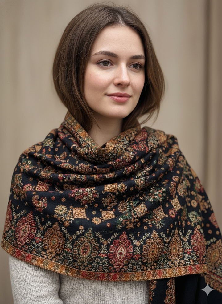 This Soft Shawl Wool Blend with kani Pattern in Black has been designed for everyday grace. Woven from a fine wool blend, it features a distinguished kani motif that lends subtle artistry to its texture. Its sleek black silhouette makes it an elegant complement to any ensemble. Blending traditional charm and modern aesthetics, it’s perfect for layering or wearing alone, adding warmth and refinement. Whether for casual outings or special events, this shawl adapts with timeless poise. A refined choice for those who value quality and expressive design. With a rich finish and soft drape, it’s a year?round keepsake.