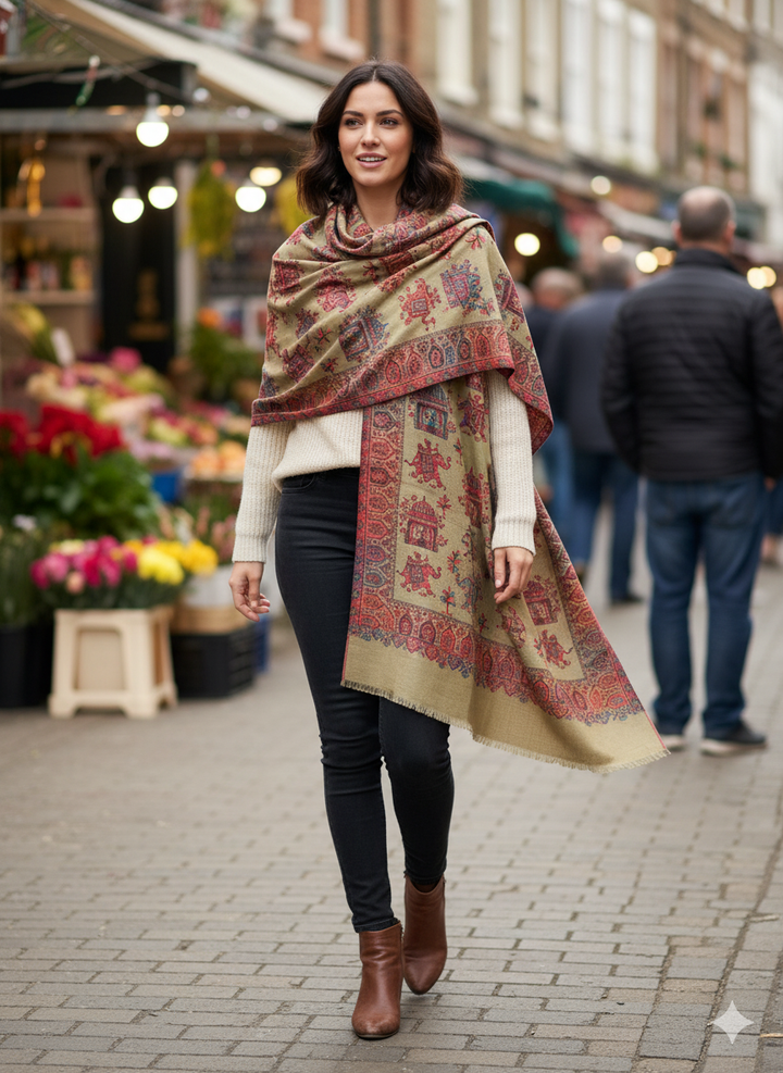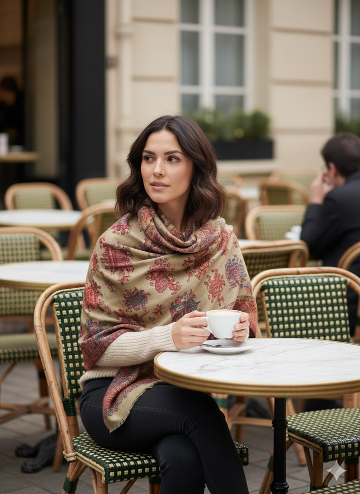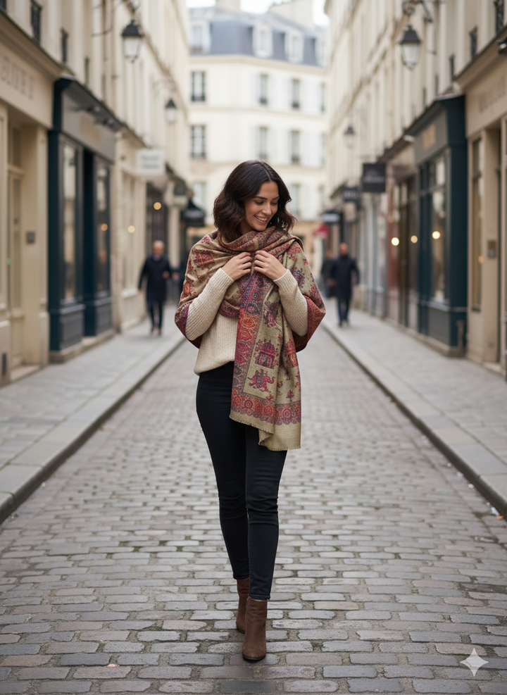 Delicately styled, this Soft Shawl Wool Blend with Subtle kani Motif in Beige features a muted kani design woven into its soft texture. Made from a fine wool blend, its neutral beige hue allows for versatile styling. The gentle motif enhances rather than dominates, offering a quiet sophistication. Whether layered or worn alone, it brings warmth and grace to your outfit. Designed for those who prefer subtle artistry, this shawl pairs heritage weaving with modern minimalism. A refined choice built for enduring elegance.