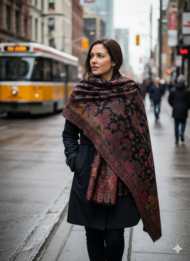Minimalist yet sophisticated, this Soft Wool Blend Shawl in Black is an essential addition to any wardrobe. Crafted from a fine wool blend, it offers a soft, insulating layer that moves with grace. The pure black hue enhances its versatility, making it ideal for pairing with any style—from sleek modern to traditional ensembles. Elegant in its simplicity, this shawl brings warmth, comfort, and effortless style to any setting. A classic choice for those who prefer timeless elegance.