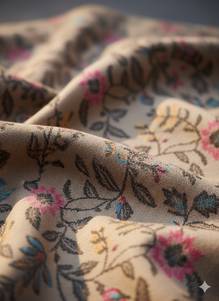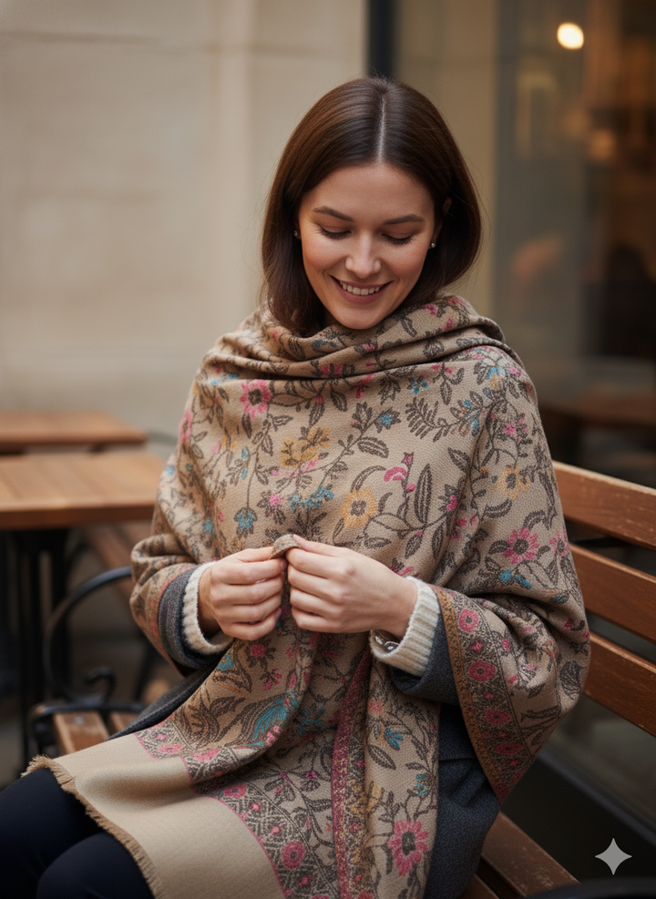 This Warm Beige Jamawar Shawl offers refined patterns woven intricately into a wool blend fabric. Its neutral tones and timeless design make it a versatile accessory for layering with both casual and formal attire.